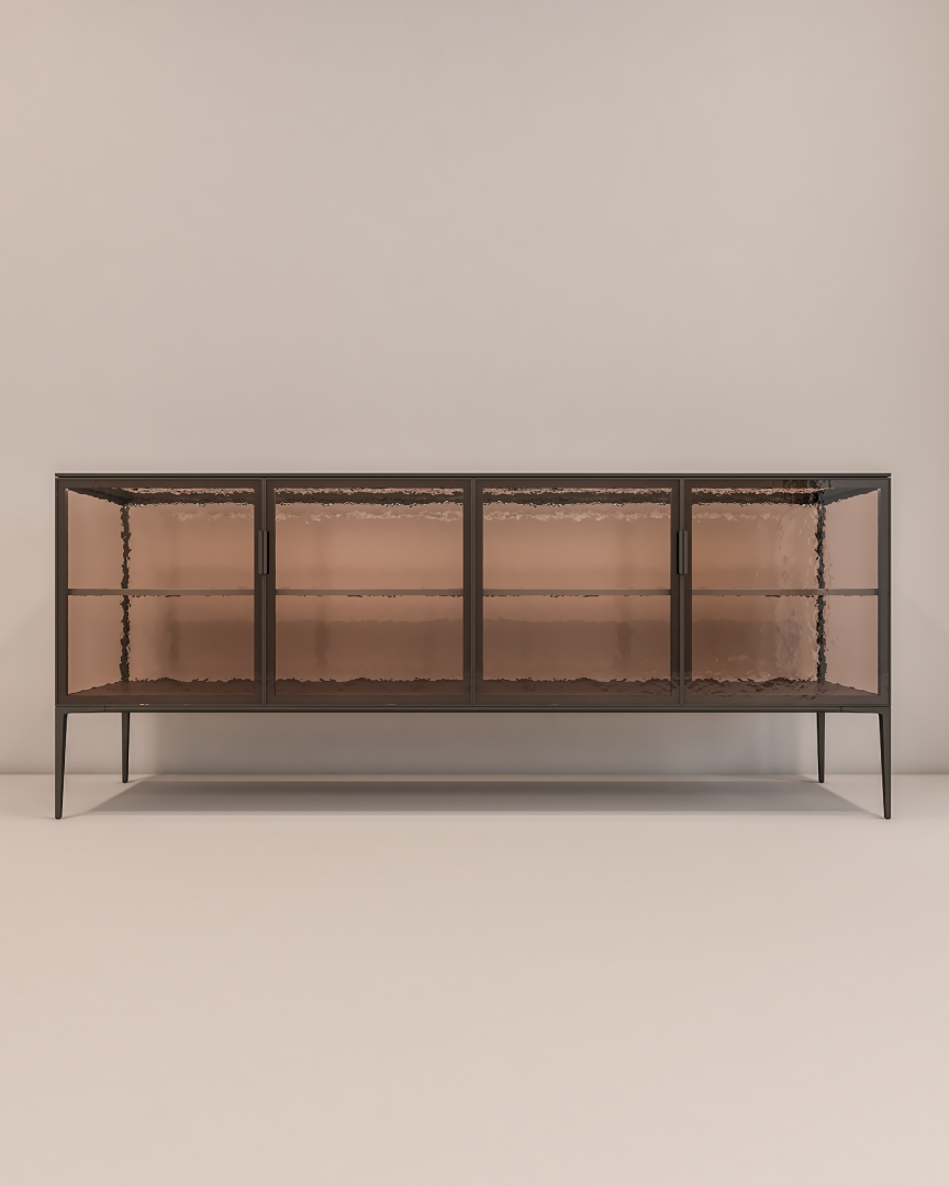 The Saray Console is a stunning, large-scale cabinet designed for luxury display and refined storage. Defined by its full-perimeter metal frame in a rich bronze or dark finish, the piece features four hinged doors crafted from translucent stained glass. Inside, multiple glass or wooden shelves offer versatile space for showcasing fine collections while maintaining a subtly artistic view of the contents.
