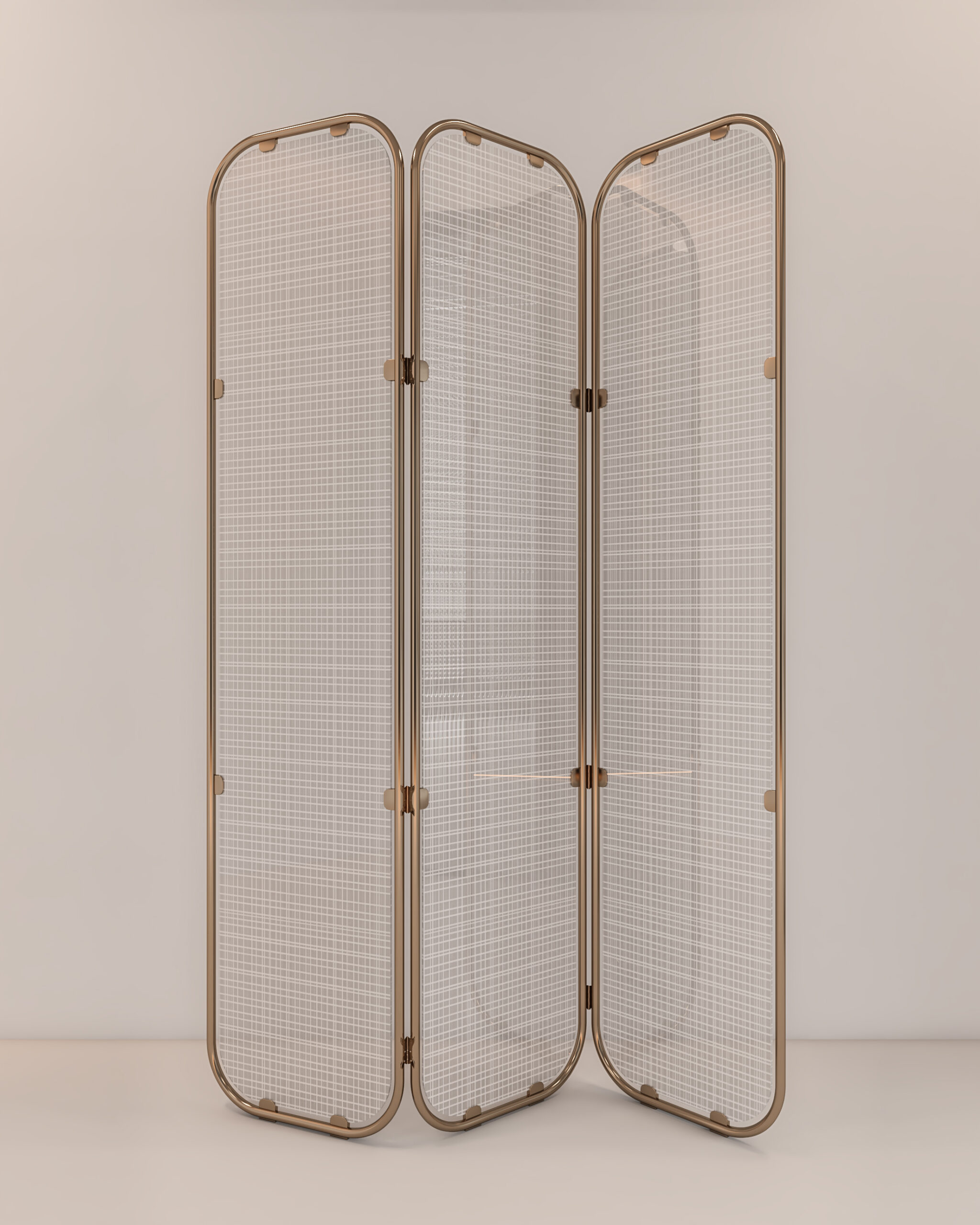 The Vista Glass Paravane blends refined aesthetics with functional versatility. Framed in smooth matte gold metal with softly rounded corners, its minimalist silhouette adds timeless elegance to contemporary interiors. Featuring three hinged glass panels, it allows flexible positioning while maintaining a sense of openness and light.