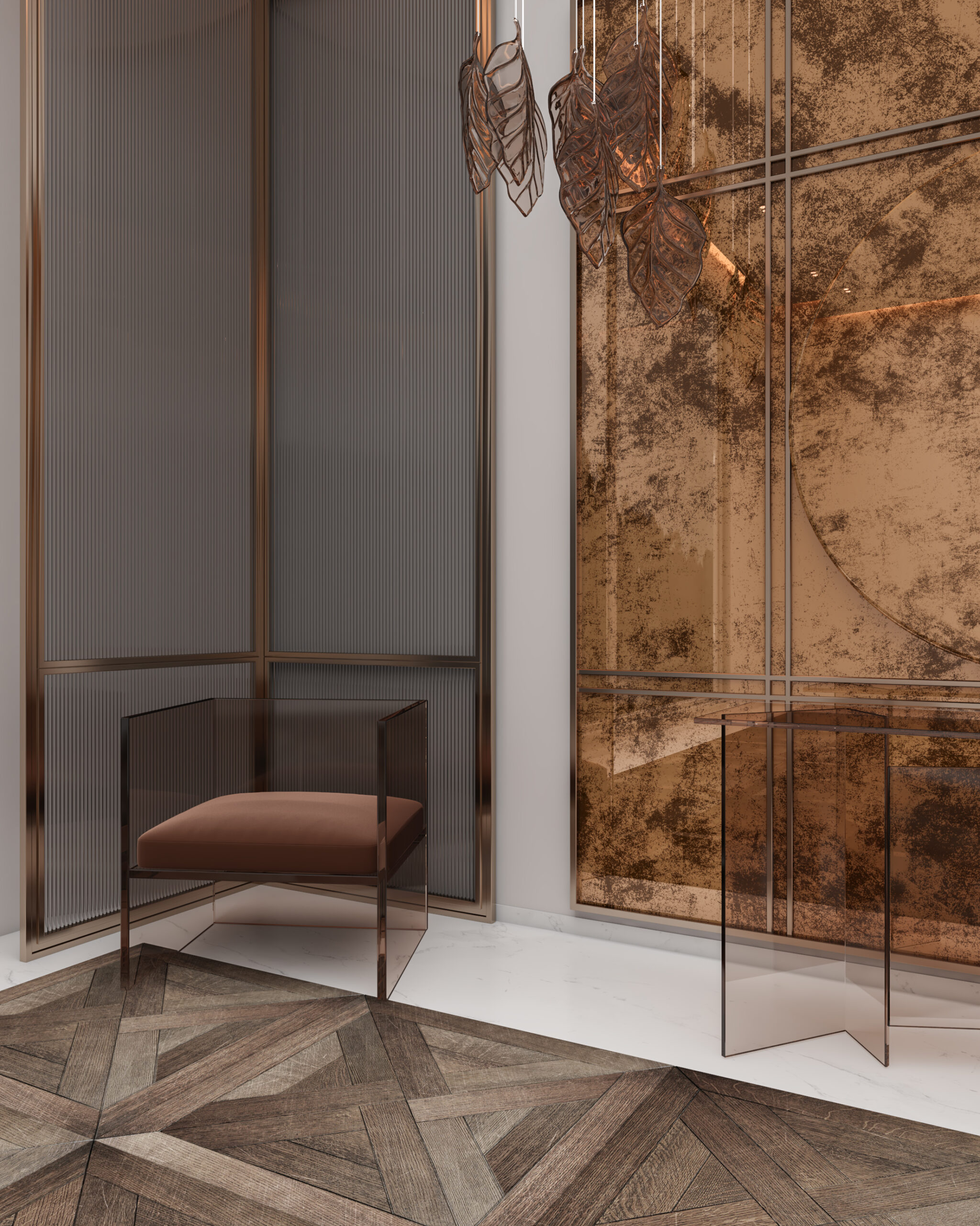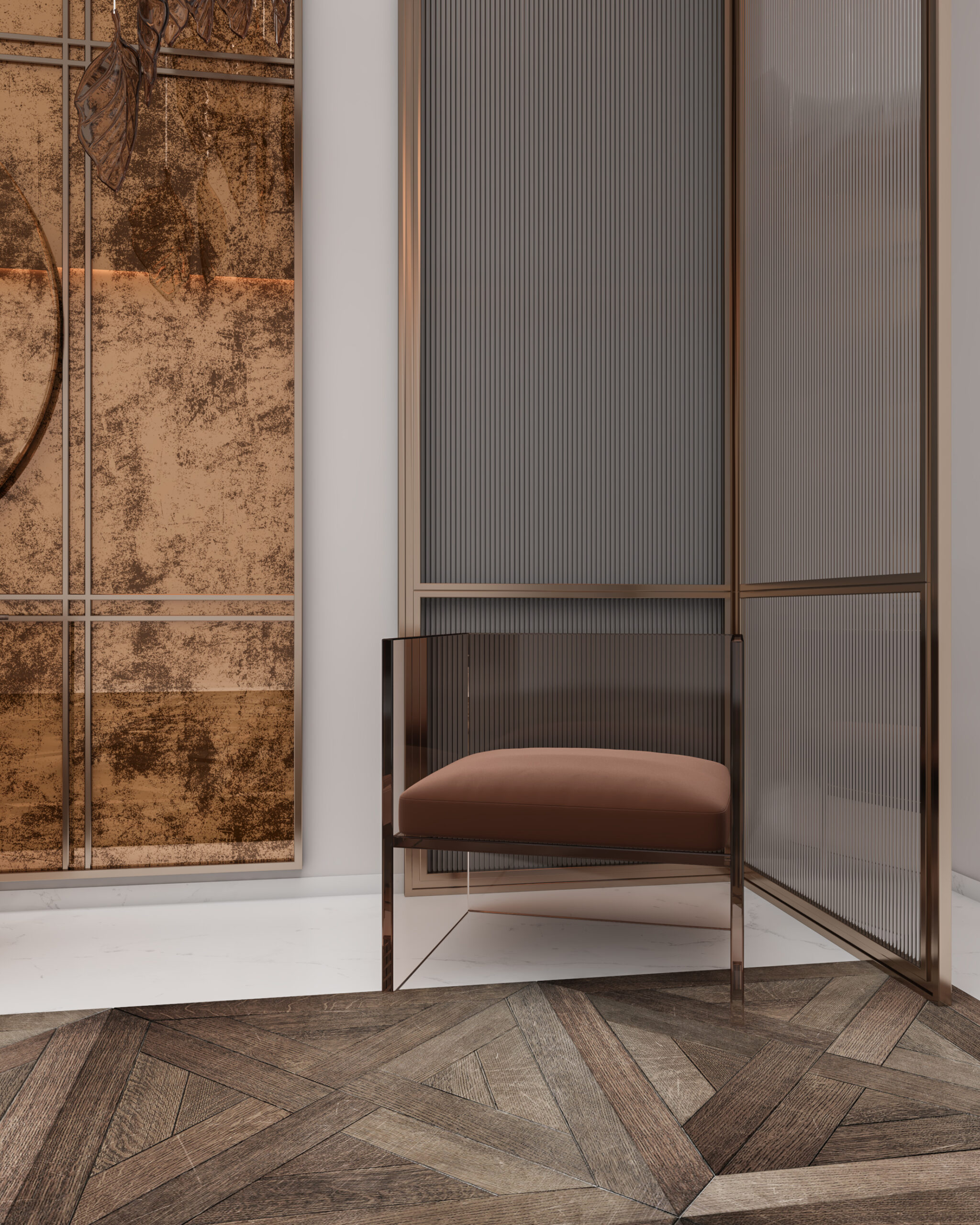 The AURA Accent Chair embodies minimalist elegance through its seamless form and refined material composition. Semi-transparent smoked acrylic panels create a sleek, sculptural frame that contrasts beautifully with the warmth of its terracotta velvet cushion. Designed to convey visual lightness and contemporary sophistication, it’s a statement piece that blends comfort with modern artistry.