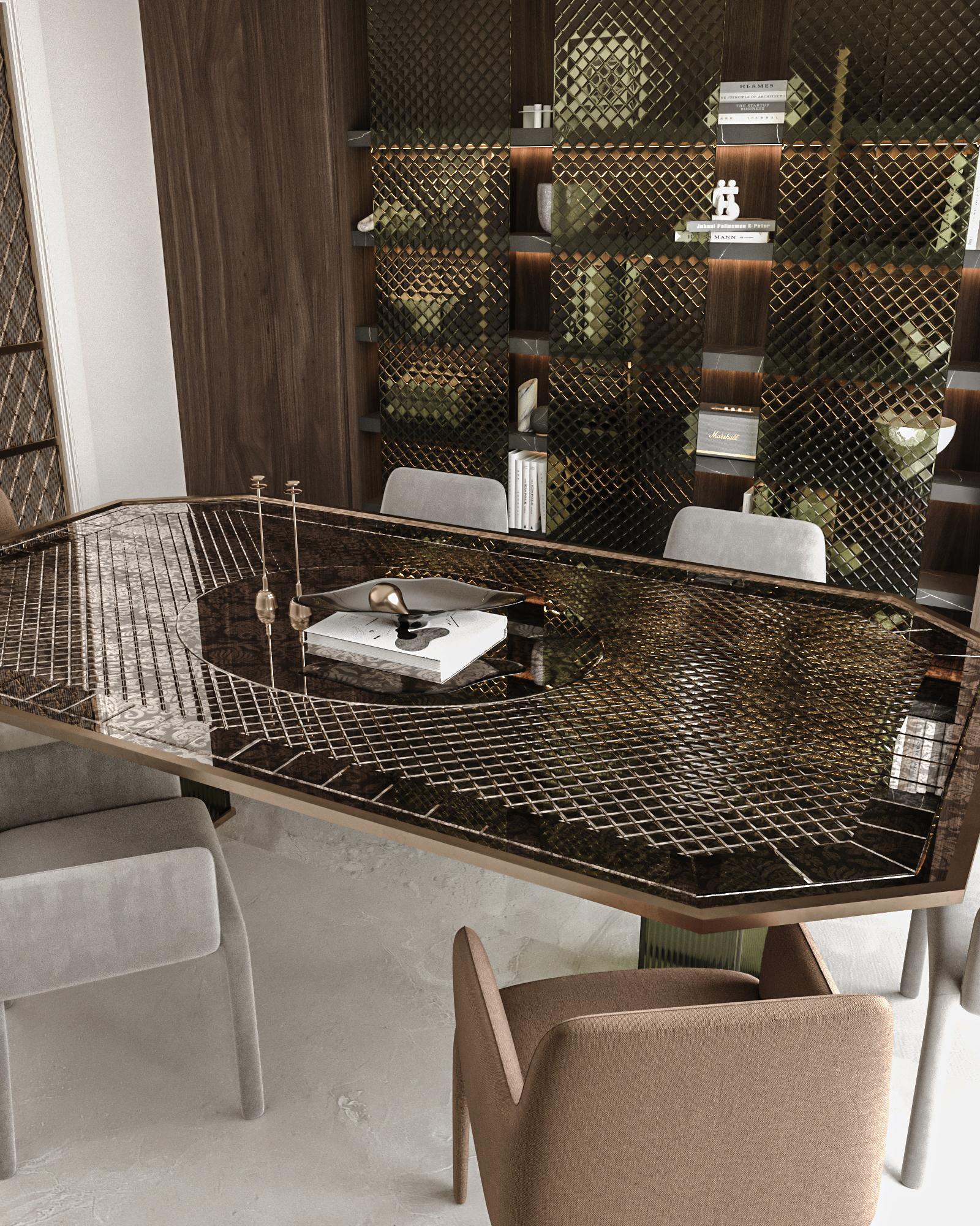The Cairo Table stands as a statement of luxury and craftsmanship, defined by its exquisite engraved and antiqued glass surface. Its bold octagonal silhouette and sculptural presence make it a true centerpiece that embodies both timeless sophistication and contemporary allure.